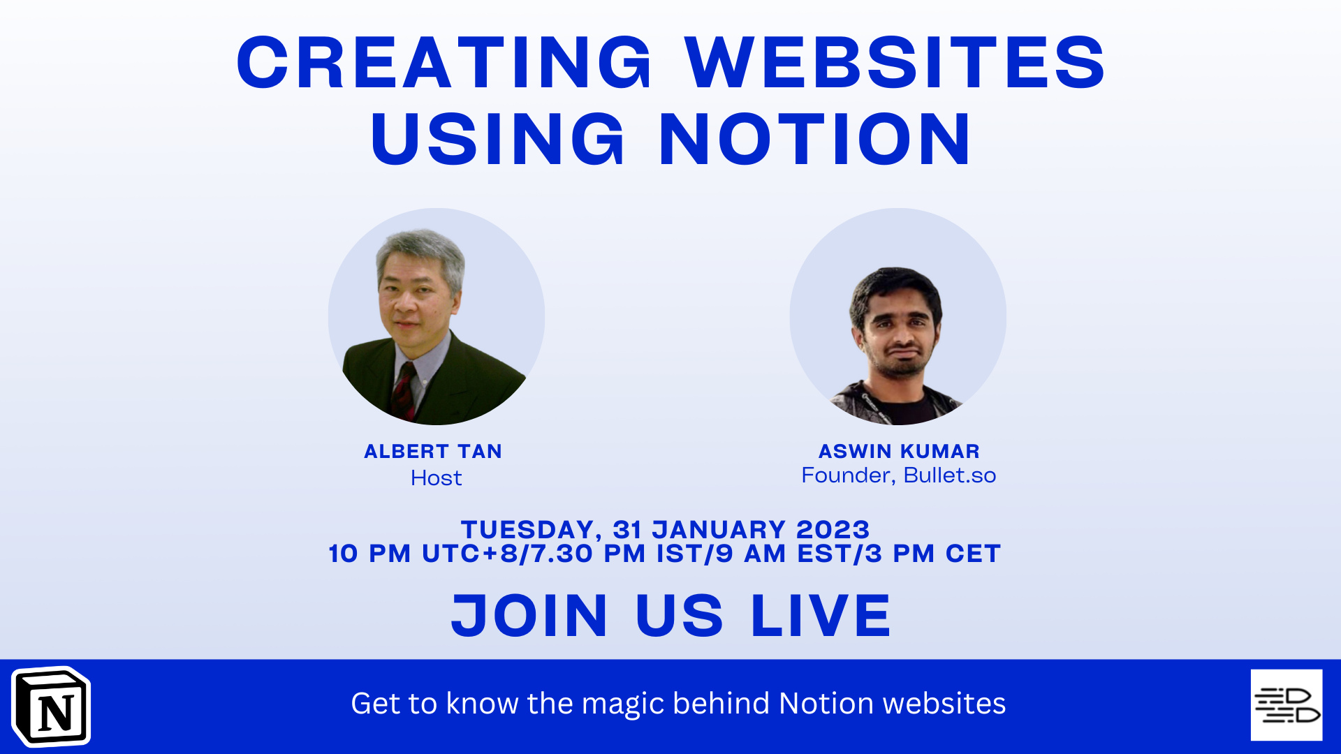 I would host the founder of Bullet.so, Aswin Kumar. He shall showcase how to build professional-looking websites using only Notion.
